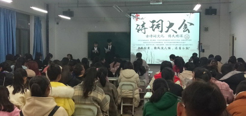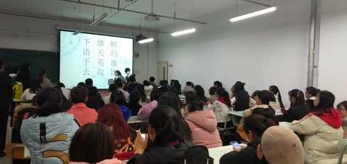 本次诗词大会分初赛和决赛两个阶段进行。主要面向2018级全体新生,以班为单位,分三个环节进行。共有三十二名学生参加了比赛。比赛题型包括诗词诵读、诗词填空、诗词对句以及文学常识等组成的四类题目,以必答和抢答的形式夺取分数。“诗词大会”活动现场龙争虎斗异常激烈,观众们也融入其中,尽情享受。最终心理咨询班获得最佳团体奖。