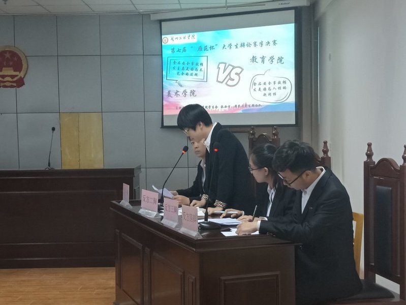 为提升学生思辨能力和创造力,丰富大学生课外生活,激发学生自主思考的能力,第七届“雁苑杯”大学生辩论赛又一次举行。于2019年4月22日20点40分,在我校模拟法庭yl6776永利集团与美术学院之间以“食品安全事故频发是因为不完善的法规还是人性的趋利性”为主题的辩论赛如期举行。我院辩手是反方,对手是正方,并由文学院孙萌老师及王少鹏、田禾、高超、张嘉文几位优秀辩手担任评委。