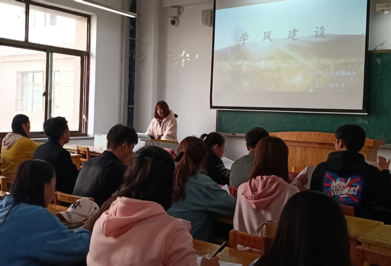 最后学习阶段是宣传部开展的关于“学风建设”的宣讲活动,由宣传部部长田丰卉进行宣讲,主要针对学生会制度,宿舍规章制度,教室纪律问题,希望全体学员能够有则改之,无则加勉。