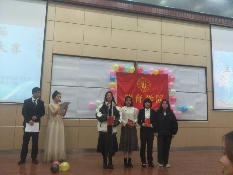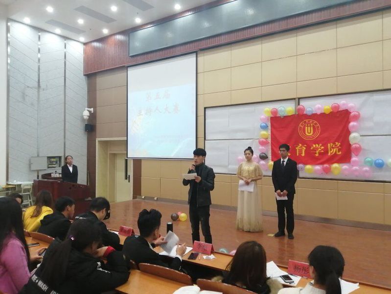 11月17日晚上7点,由教育学院学生会文艺部主办的第五届“争锋金话筒”主持人大赛在5-205教室举行,此次比赛的评委有分团委副书记杨彤,学生会主席田文攀,副主席段高飞、黄晶朋、李彪,生活部部长戴变变,文艺部部长王璐等。