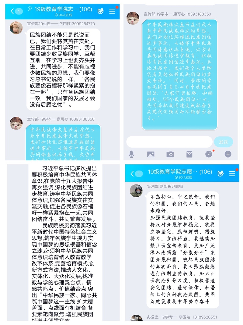 此次会议首先了解了民族团结的意义。在会议过程中,同学们积极发言,表达了自己关于民族团结的看法。其中,来自19级学专一班的卢芳明同学说到:“民族团结不能只是说说而已,我们要将其落在实处。在日常工作和学习中,我们要团结少数民族同学,互帮互助,在学习上也要齐头并进,共同进步,不能有歧视少数民族的思想,我们要像习近平总书记说的一样,‘各民族要像石榴籽那样紧紧的抱在一起’,只有各民族团结一致,我们国家的发展才会没有后顾之忧”。康可心同学也谈到了自己的看法,她说“中华民族伟大复兴是近代以来中华民族最伟大的梦想,我们必须扎实推进民族团结进步事业,以铸牢中华民族共同体意识为主线,大力开展民族团结进步教育,积极培育民族团结进步意识。在此过程中,我们每个人要切实肩负起加强民族团结的重大责任。”同时,普珍同学也说到了自己心目中的民族团结:“大家守望相助、和睦相处,56个民族团结一心,共同为把我国建设成社会主义现代化强国而不断努力奋斗。”