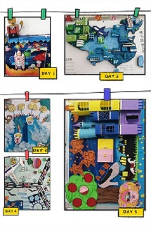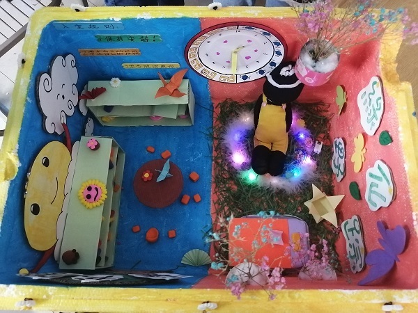 本次展览的作品丰富多样,墙饰作品,从观赏型到实用型,从平面到半立体互动,作品要求越来越高,制作难度也是越来越大。墙饰里镶嵌真正的钟表,教小朋友学习时间,区角设计里各种带电路的闪闪发亮的灯饰,都体现了同学们对区域环境创设的理念已经进入了实用阶段,并跨学科地应用了电路知识。区域环境的创设部分,同学们设计的有自然角、读书角、娃娃家、美食区、种植区等等,真可谓是将我们的环创设计理念和精髓展现的淋漓尽致。同学们制作的手绘本作品惟妙惟肖,在制作的抗击疫情作品中,就把奋笔写下“请战书”的白衣天使们、争分夺秒鏖战在火神山、雷神山医院的施工人员,以及在2020年抗疫工作中的英雄代表们,都展现的酣畅淋漓;在制作的中国各大传统节日中,新年的欢乐、中秋的团圆、国庆的欢庆以及七夕的浪漫,也都表现得头头是道。