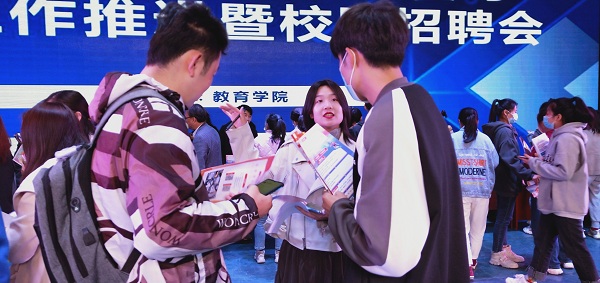 学而思网校西安分校、猿辅导西安分公司、幼儿之家教育集团、华图教育、兰州天童教育集团凯玄分校等招聘单位代表进行了宣讲。随后,48家单位分区域开始招聘。招聘场面异常火爆,展位前挤满了前来咨询的毕业生。学生们就单位性质、工作区域、薪资待遇、发展空间等关心的问题逐一提问,招聘单位耐心解答、积极动员。