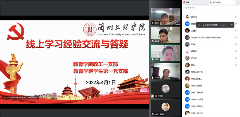 为切实强化疫情防控工作,深入学习贯彻习近平总书记的重要讲话和指示精神,持续推动我院“我为群众办实事”实践活动走深,走实。在疫情防控关键时期,为解决数学系全体同学在学习及生活中存在的问题,yl6776永利集团教工第一党支部、学生第一党支部于2022年4月1日联合开展了“线上学习经验交流与答疑”活动。本次活动共有来自yl6776永利集团教工第一党支部全体教师、学生第一党支部全体党员、预备党员、积极分子及数学系全体学生共300余人参加。