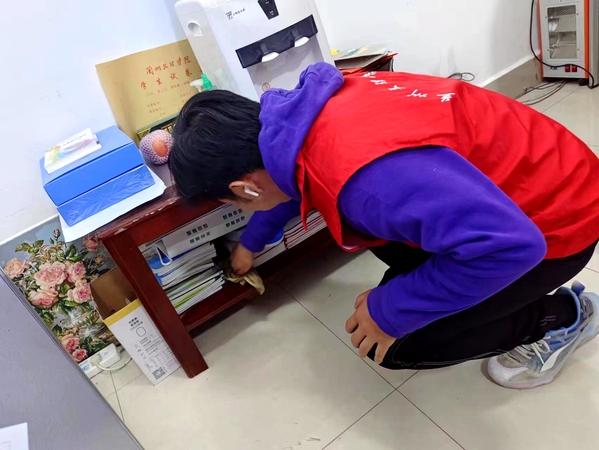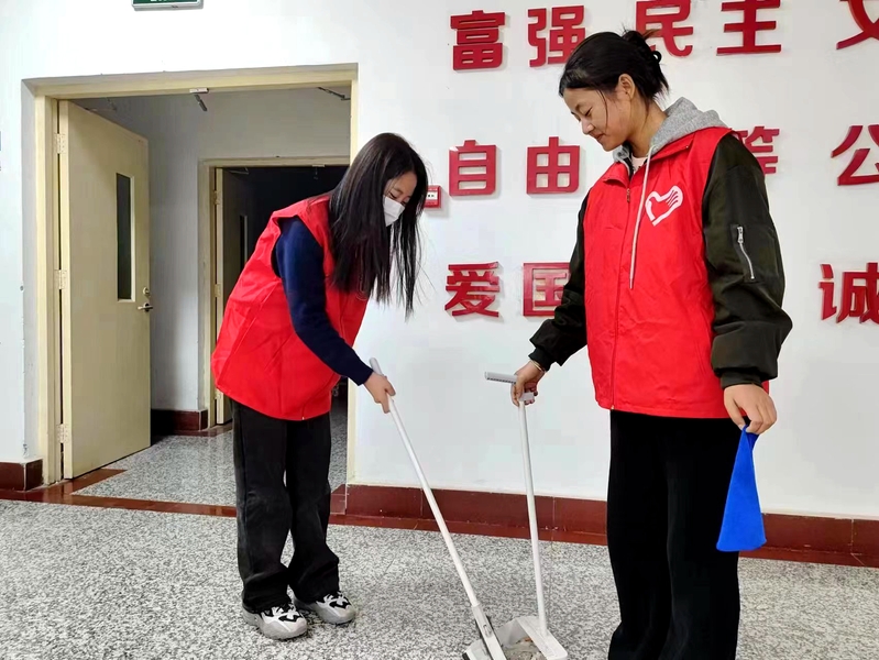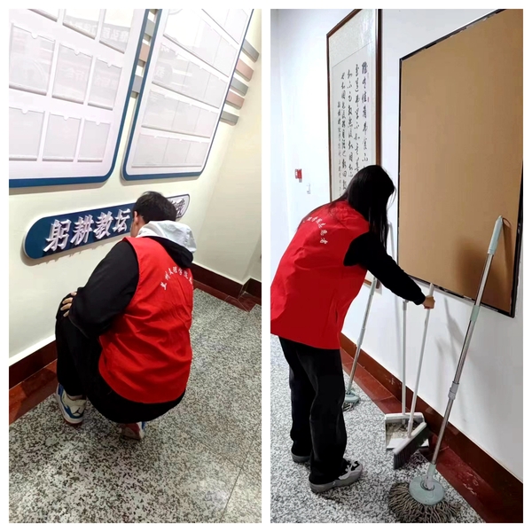 志愿者们深入到区域内的各个角落,先对楼道内的垃圾、墙角砖、门窗上的污垢、桌椅、手工作品放置架上的灰尘等进行深度清理,之后对学院会议室、资料室和公共区域进行了整理、打扫。最终在志愿者们的努力下,学院的环境得到了明显的改善,走廊变得干净整洁,公共区域焕然一新。