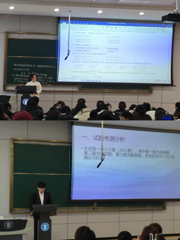 汇报中,21级学生展示了命制的数学期末试卷、22级的学生展示了中学数学教学设计,并选择部分内容进行讲解。