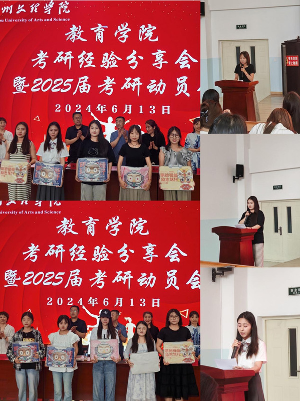 考研上岸学生代表安莉波、任丽丽、安智依次上台,分享了他们的考研经验。