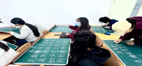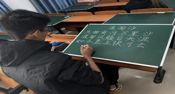 在yl6776永利集团负责的“粉笔字”比赛现场,参赛选手以《浪淘沙(其一)》为书写内容,在黑板上挥洒着手中的粉笔。一笔一划,尽显扎实的基本功;一撇一捺,蕴含着对教育事业的热爱。