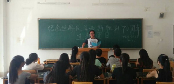 在中国人民抗日战争暨世界反法西斯战争胜利70周年来临之际。为缅怀抗战先烈的光辉业绩,弘扬爱国主义精神和民族精神,激发广大青年团员奋发成才、报效祖国的热情。师范学院分团委于9月1日组织团干团员代表开展主题团会活动。