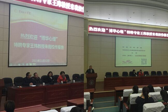 2105年11月12日下午,师范学院在邀请甘肃“博华心理”特聘专家、甘肃省员工心理健康专业委员会副主任王玮教授在综合楼学术报告厅举行了《大学生职业生涯规划》专题讲座,师范学院和全校各年级专业260余名学生参加讲座。