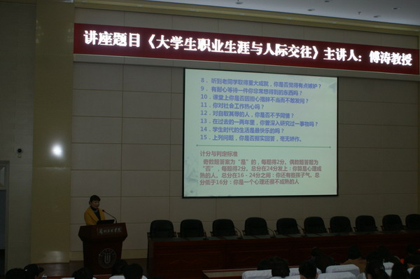 加强大学生心理健康教育,3月23日下午,师范学院傅涛教授在学术报告厅举行了题为《大学生职业生涯与人际交往》的讲座。300余名师生参加了讲座。