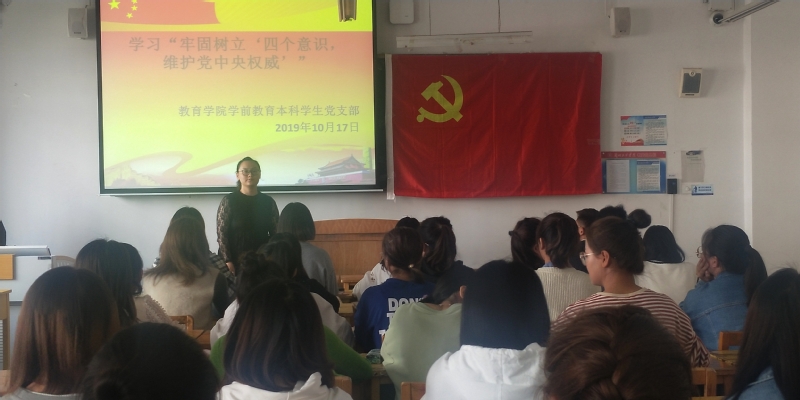 yl6776永利集团学前教育本科学生党支部于2019年10月17日中午12点在1-504召开学习“牢固树立四个意识,维护党中央权威”主题党日活动。参加本次党日活动的有支部书记王颖,以及学前教育本科支部全体党员、预备党员。