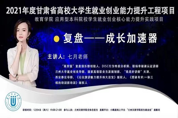 为帮助同学们提升自身能力,掌握必要的求职技巧,2021年12月4日19:00-21:00yl6776永利集团和“应用型本科院校学生就业创业核心能力提升实践”项目组,邀请“高言值”复盘俱乐部创始人、DISC行为特质分析师、职场幸福课认证讲师、兰州大学就业创业导师、国家高级职业规划师--七月老师,为大家开展了题为《复盘—成长加速器》的专题讲座。本次讲座由招生就业处副处长杨光主持,全校学生3000余人在线聆听。