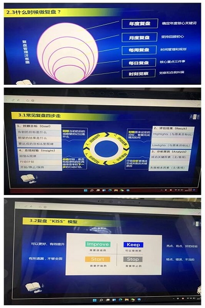 接下来七月老师利用KISS法则和4F复盘分别对年度、月度、周、日复盘图进行了详细解释;让同学们通过亲自参与“月度之花、TO DO LIST”等形式来体会复盘的具体做法,同时七月老师又教给大家用“今日小确幸、今日待提升、明日之计划”来提高幸福感、成就感,最后七月老师建议同学们:“先处理情绪,再处理情况;先解决心情,再解决事情”,“所有的事都是好事,如果你认为不是好事那是因为你没有复盘”。