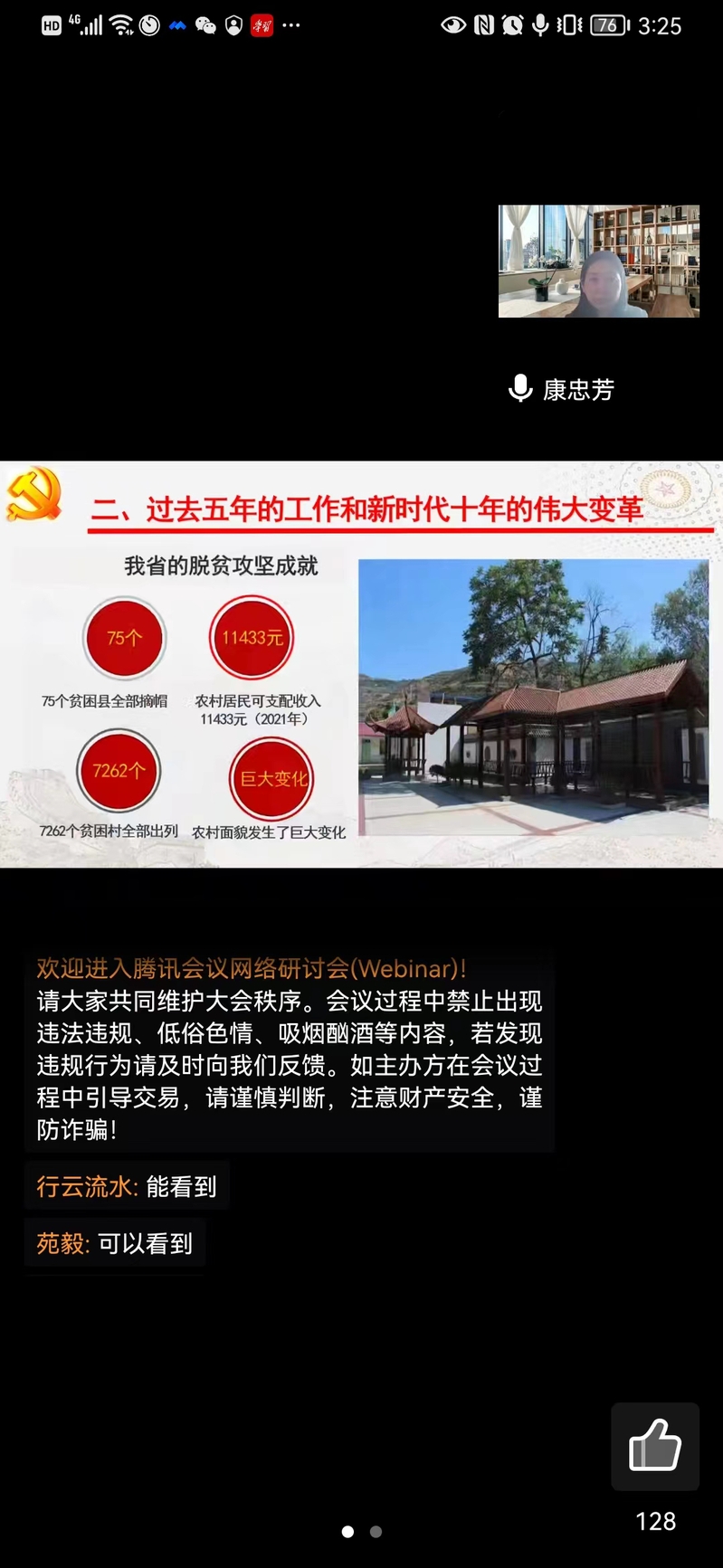 2022年12月6日下午,学校邀请了特邀党的二十大代表、全省学习贯彻党的二十大精神专家学者讲师团成员、省社科联学术部副部长康忠芳同志作党的二十大精神专题宣讲报告,我总支理论学习中心组利用此次机会进行了2022年第12次中心组学习会,学院党总支书记、院长张莉,副院长王成德、彭建奎及各支部书记均通过在线方式参加了此次学习。