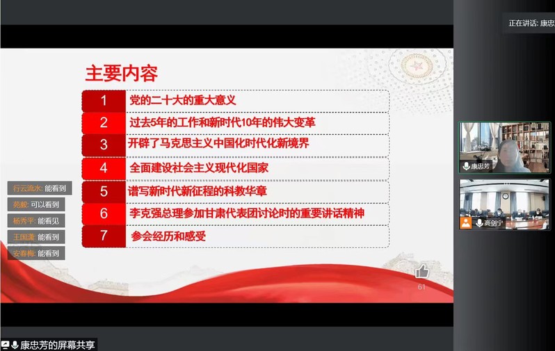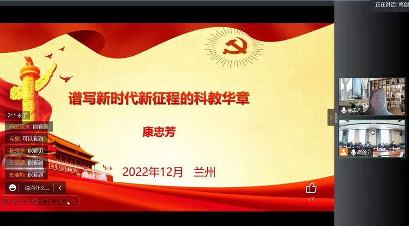 报告会上,康忠芳同志以《谱写新时代新征程的科教华章》为题,分别从党的二十大的重大意义、过去5年的工作和新时代10年的伟大变革、开辟了马克思主义中国化时代化新境界、全面建设社会主义现代化国家、谱写新时代新征程的科教华章、李克强总理参加甘肃代表团讨论时的重要讲话精神以及自家自身参会的经历和感受等方面进行了宣讲。