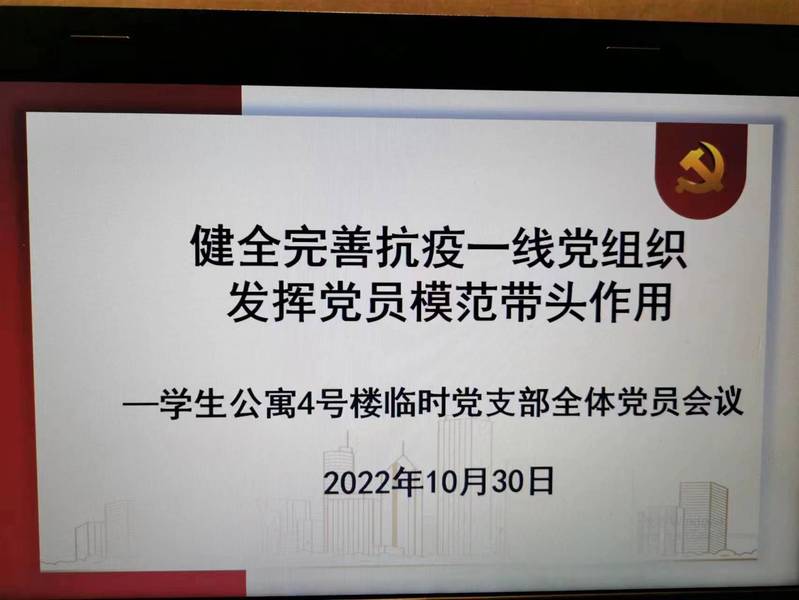 张莉同志肯定了全体师生党员在4号楼的疫情防控工作中付出的努力及工作成效,根据临时党支部支委会关于党小组设置的决定,宣布了4号楼八个党小组组长、成员名单及联系的教师党员,并就如何在学校疫情处置扫尾冲刺阶段更好地发挥党支部战斗堡垒作用及党员模范带头作用进行要求,希望各位党员能主动“亮身份、当先锋、见行动、作表率”,旗帜鲜明地站在学校疫情防控的第一线,传播正能量,用自己的行为影响身边的其他同学,带领全体同学遵守校纪校规,共同参与到抗疫工作中来,共同为学校教育教学秩序的早日恢复做出贡献。
