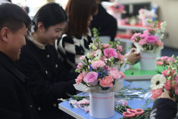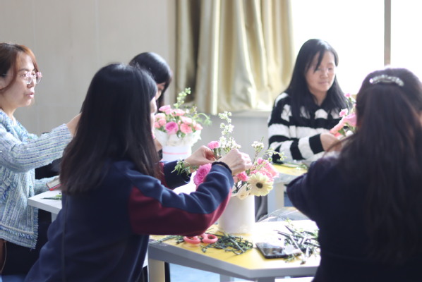 花艺培训师围绕东方插花史简要、中国传统插花的美学意象、花材识别、色彩搭配、插花技巧等五个方面进行了花艺基础知识讲解,分享了各种花所蕴含的花语和祝福,实践演示了插花艺术的基本技巧。老师们结合讲解和手中花材的特点,从去叶片、剪花刺,到架构框架、选花材、配颜色,凭借自己的巧手和创造,把手中原本普通的花草,通过修剪修饰、巧妙搭配、创新组合之后,变成各具特色的花艺作品,洋溢着春天的气息。