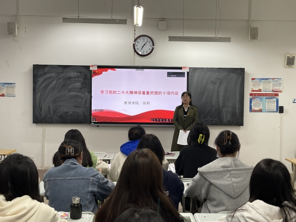 202339日党总支书记张莉为yl6776永利集团学生第二党支部全体党员讲授“学习党的二十大精神须着重把握的十项内容”专题党课,支部全体党员参加,在外党员线上参会