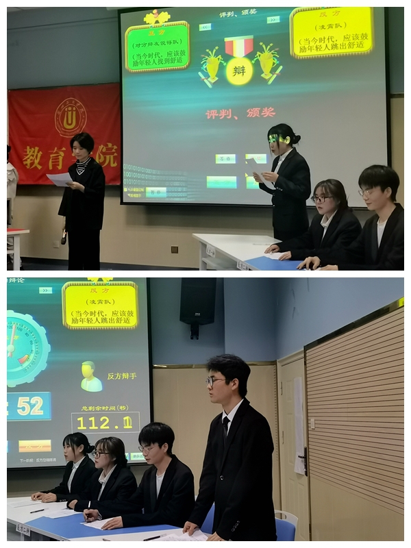 经过简单的双方辩手介绍及问好,比赛正式拉开帷幕。正方从舒适圈的定义等方面对“当今时代应该鼓励年轻人找到舒适圈”进行开篇立论,反方则根据现有社会现象及多方面信息为支撑进行层层剖析,论证其“当今时代,应该鼓励年轻人跳出舒适圈”的观点。攻辩环节中双方你来我往,针锋相对,比赛到达白热化阶段;自由辩论环节,双方分别根据对方的漏洞进行攻击,激烈不失条理,双方四辩进行总结陈词。现场反响激烈,台下观众踊跃发言,对自己有疑惑或不赞同的地方进行提问。最后正方获得了胜利。