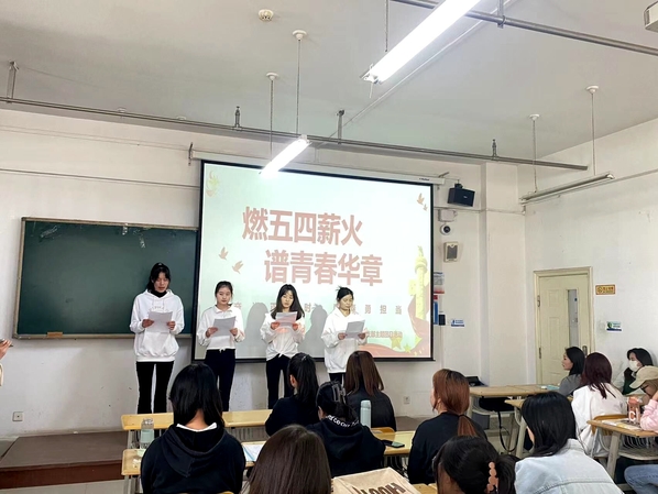 22级学校教育专升本二班团支部、22级学前教育班团支部以朗诵比赛形式,歌颂伟大的五四精神,深化了爱国主义教育和革命传统教育。22级学前教育专升本张丽晶等四人朗诵《沁园春长沙》,倾诉着对毛主席,对中国革命,对中国共产党的感激和热爱之情,他们带我们重返“湘江北去,橘子洲头,看万山红遍,层林尽染”的壮丽场景;22级学前教育班马丽等三位同学以朗诵《无关年龄,青春万岁》,表达了中国共产主义青年团在中国共产党的正确领导下追求崇高而神圣的理想和“五四”精神薪火相传、青春无悔的初心使命和担当精神。