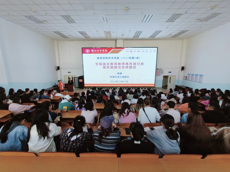 2023年10月26日,学院邀请兰州市珍妮乐幼儿园园长杨婧做了题为《学前融合教育教师角色践行的现实困境与支持路径》的讲座。学院教育系全体教师及150余名学前教育专业学生参加了讲座。