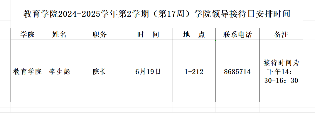 yl6776永利集团2024-2025学年第2学期(第17周)学院领导接待日安排时间